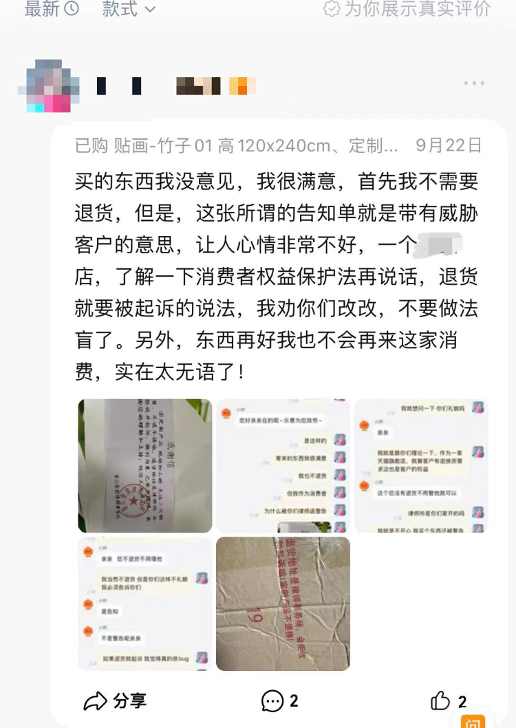 消费者在评价商品时表示商家的告知书有“威胁”的意思。 网络图