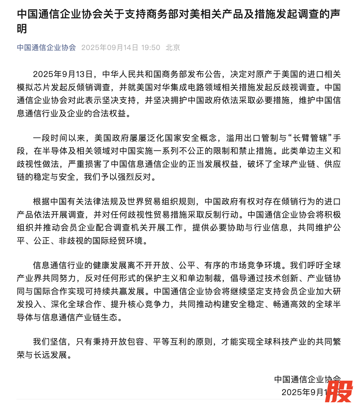 中国通信企业协会:支持商务部对美相关产品及措施发起调查中国通信企业协会:支持商务部对美相关产品及措施发起调查